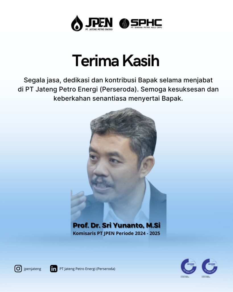 PT JPEN turut mengucapkan terima kasih kepada Bapak Prof. Sri Yunanto, M.Si atas jasa, dedikasi dan kontribusi sebagai Komisaris periode 2024-2025.