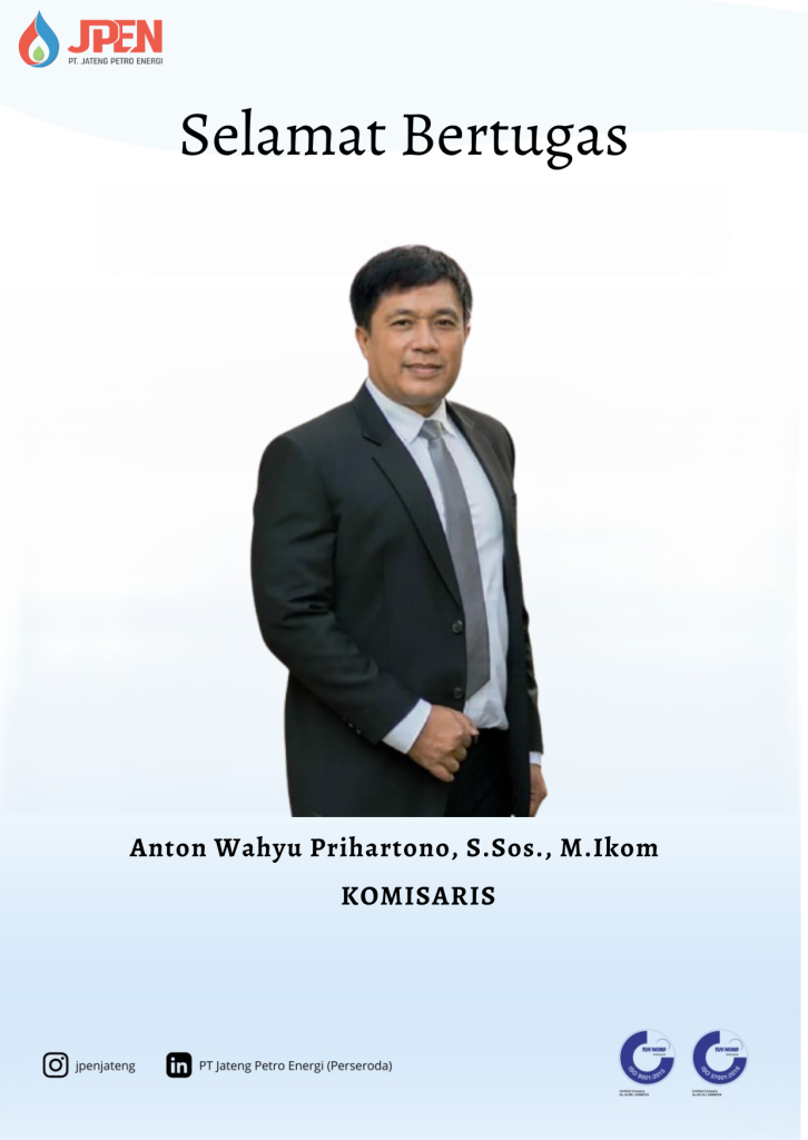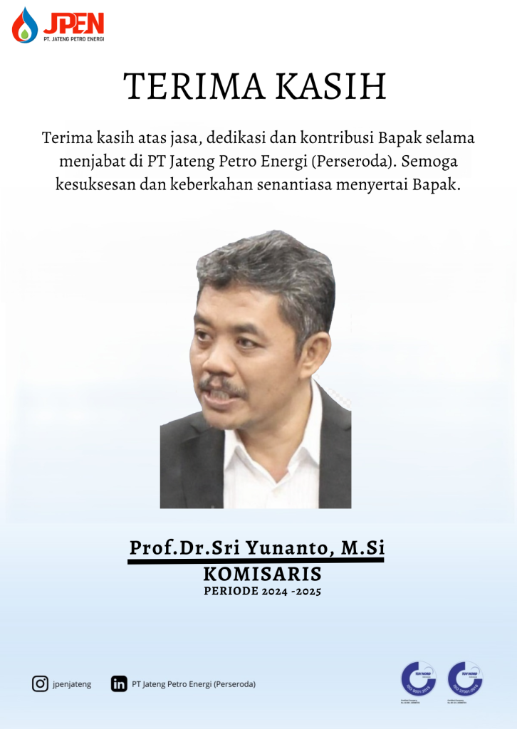 Terima kasih kami ucapkan kepada Bapak Prof.Dr.Sri Yunanto, M.Si atas jasa, dedikasi dan kontribusinya selama menjabat Sebagai Komisaris Independen di PT Jateng Petro Energi (Perseroda) semoga kesuksesan dan keberkahan senantiasa menyertai Bapak. Selamat bertugas kami ucapkan kepada Bapak Anton Wahyu Prihartono, S.Sos., M.Ikom selaku Komisaris Independen, semoga Bapak akan selalu membawa perubahan ke arah yang lebih baik bagi PT Jateng Petro Energi.